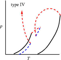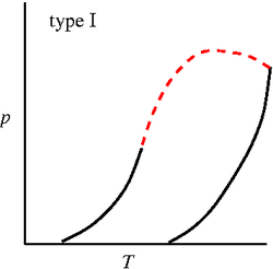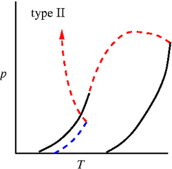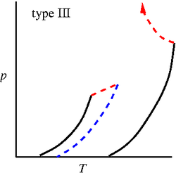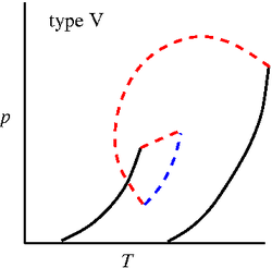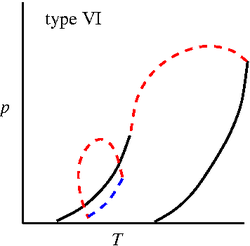 Binary phase diagrams for liquids and gasses. Studied by Johannis Jacobus van Laar using the Van der Waals equation of state [1][2][3][4][5]. The six major types of binary mixture phase diagrams, as identified by Scott and Konynenburg [6][7] (in the pressure-temperature plane) are given by (solid lines: vapour pressure of the two components, blue dashed lines are three phase lines and red dashed lines are critical lines) [8][9]: