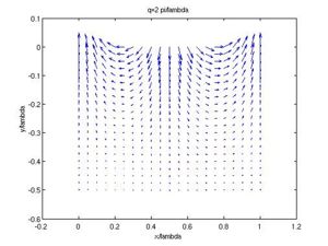 We may now find the velocity field, , which shows the well-known circles: the elements of fluid undergo circular motion in the plane, with the circles getting smaller at deeper levels. The displacement of a fluid element is given by , and is plotted in Figure 1.