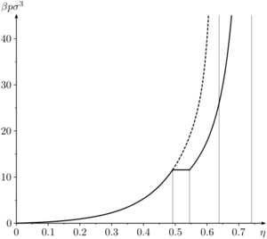 The hard sphere system undergoes a liquid-solid first order transition [19] [20], sometimes referred to as the Kirkwood-Alder transition [21]. The liquid-solid coexistence densities () has been calculated to be