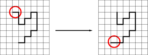 Reptation moves are also known as the "slithering snake" model [1]. It is particularly useful in lattice simulations of long chain molecules such as polymers. One randomly chooses one of the two ends to become the head of the snake. One then removes a piece of its tail, and after another random selection between freely available sites, one tacks on a new section to become the new head of the snake. For example: